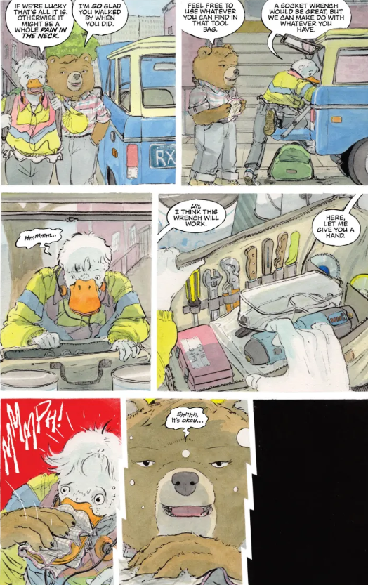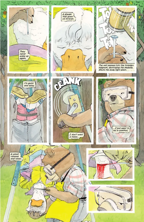 His illustrations are cute, and they remind me of all the different children’s classics that I mentioned above, and more. He has a fantastic eye for page composition though. In the first two pages, he shows you everything you need to know about Woodbrook, he establishes Samantha’s character, he sets the scene for the twist. We know it’s coming, but it doesn’t make it any less horrific. As the narration begins to set out Sam’s rules of killing, there’s a sense of dread that creeps in, and he paces the panels just right that we know it’s coming but when she drugs and kills her victim, it’s no less horrifying.