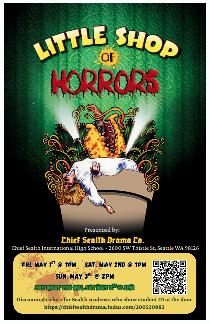 Summary : Enjoy this musical production of Little Shop of Horrors in Chief Sealth's theatre. May 1st at 7 p.m., May 2nd at 7 p.m. and May 3rd at 2 p.m.